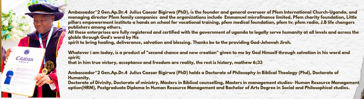 This event took place on 11th-may-2024, at wakiso town council where by Ambassador*2 Gen.Ap.Dr*4 Julius Bigirwa (PhD) was award the Ambassadorial award for Peace and Global Education from Wisdom University Nigeria,